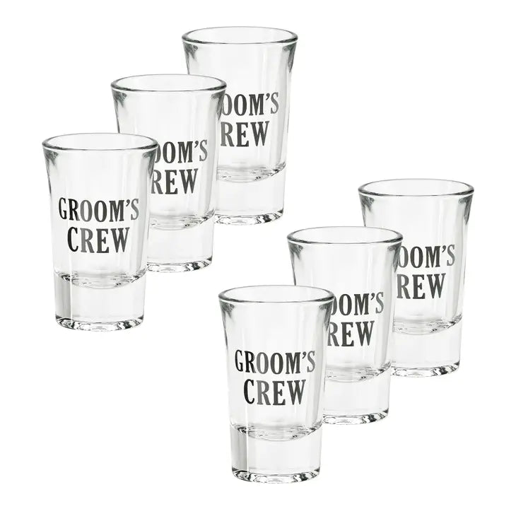 Have the Groom's Crew celebrate with these party shot glasses. They are perfect for the bachelor party and great favors for your wedding party guests. Give them out as gifts for the groomsmen, alongside a bottle of their favorite liquor. The set consists of 6 shot glasses with the saying "Groom's Crew" written in black. The 1.5 ounce glasses have an easy-to-hold flared shape, a weighted base to prevent tipping and spilling.